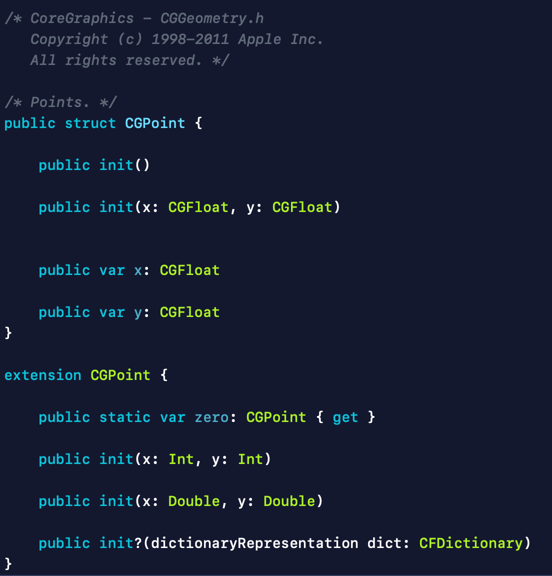 프레임 워크를 따라 들어가 보았더니 CGFloat값을 x와 y값으로 받는 단순한 구조체로 이루어져 있는 것을 확인할 수 있었습니다.