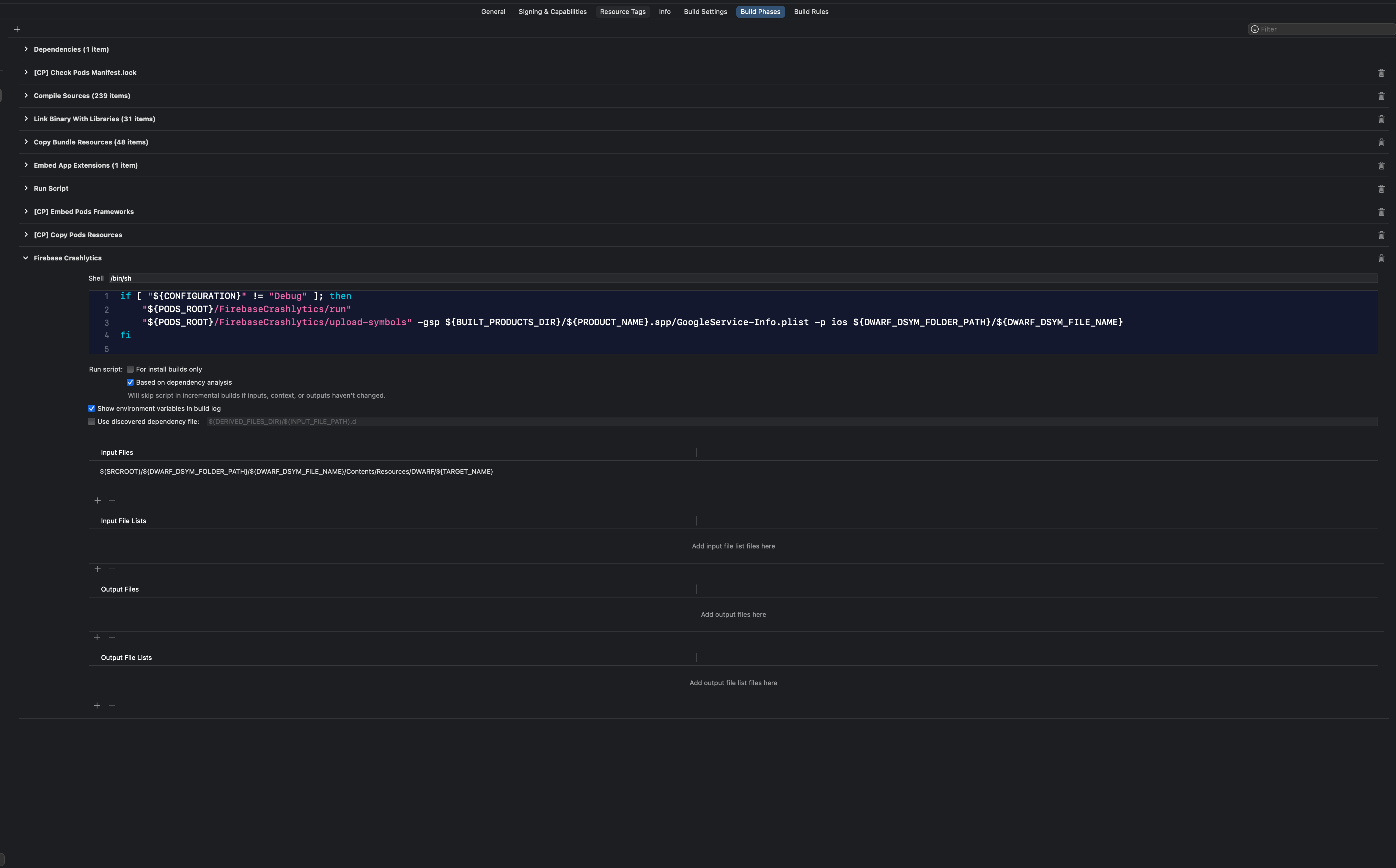 답변에 나와있는대로 해결하기 위해 Firebase Crashlytics를 Build Phases의 가장 마지막 부분으로 옮겨주었더니 해결이 되었습니다.