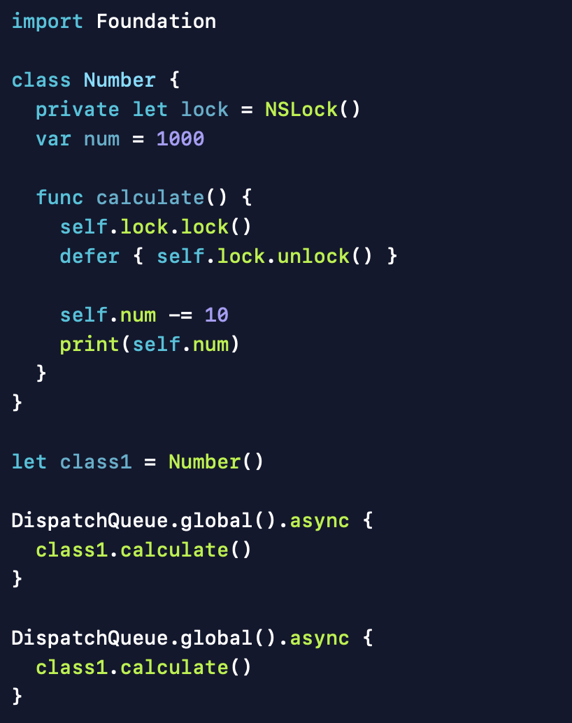 - 접근 순서를 의도적 또는 비 의도적으로 직렬화하여 의도치 않는 결과를 피하는 연산 방식.NSLock 객체를 사용하여 애플리케이션의 글로벌 데이터에 대한 액세스를 중재하거나 중요한 코드 섹션을 보호하여 원자적으로 실행할 수 있습니다.